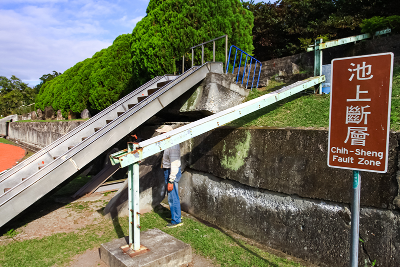 隨後,所有人一同走進可愛的大坡國小,就是為了一睹一座不停長高的溜滑梯!國小裡的溜滑梯恰好橫跨了菲律賓海板塊與歐亞板塊的交界,可以明顯觀察到斷層移動的痕跡;當雙腳跨踩在水溝上,也等同於踩在兩個板塊上,這可是台灣島嶼生成的見證呢,感覺很是神奇。