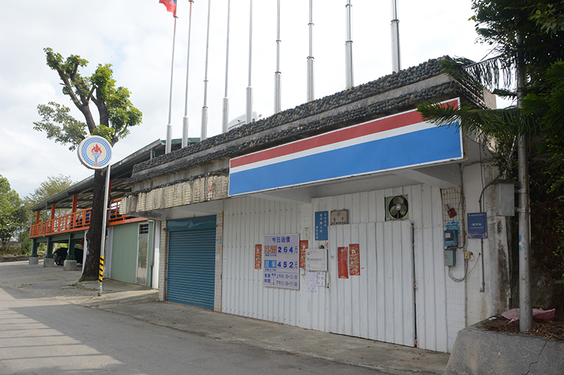 機車駛過轉角,看到一間小平房怎麼車子進進出出,有的提著一桶油,有的帶著塑膠管,這邊機車加油也很不同,沒有加油島也沒有油槍,用的是馬口鐵桶與塑膠吸管來幫車子加油,是目前全台唯一僅存的聽裝加油,站長說鄉下加油不方便,架子上排列整齊的汽油桶最小為10公升一聽桶,每次最少購買一桶油,沒用完的就貼上姓名、連絡電話儲放在站內,像是村民們的自家油倉一般。
