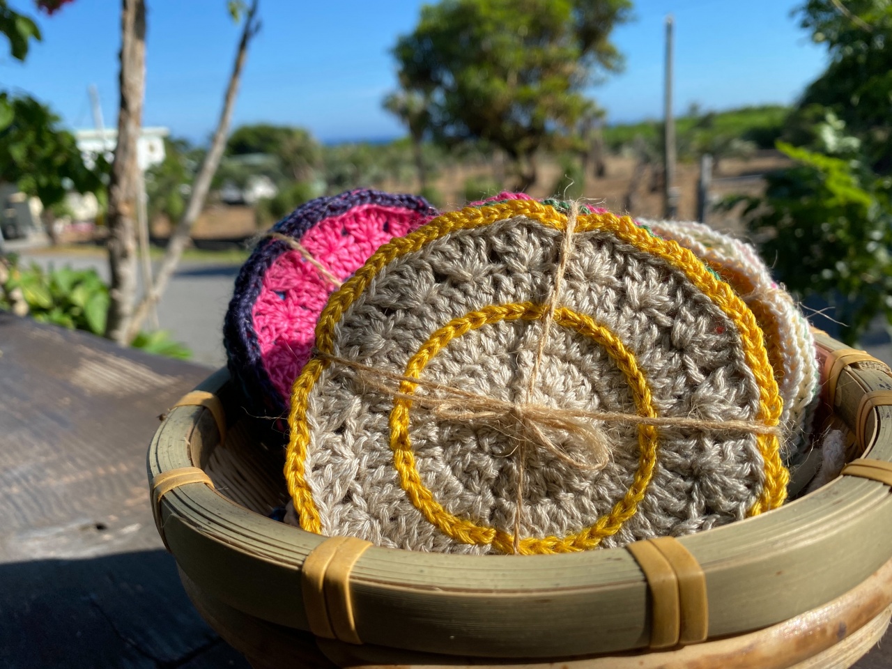 織女們圍在一起,一邊話家常一邊手裡鉤織著美麗的作品,小至杯墊大至手提包,還有因應新冠肺炎疫情而生的「口罩延伸帶」,解救大家被口罩耳繩勒紅的耳朵,除了利用苧麻線鉤織的織品外,織女們也會使用線材與海廢,加上織女擅長的鉤織技法,將原本破碎的貝殼、小石頭、漂流木變成美麗的飾品或裝飾物,讓大家可以將屬於都蘭的海邊記憶收藏起來。