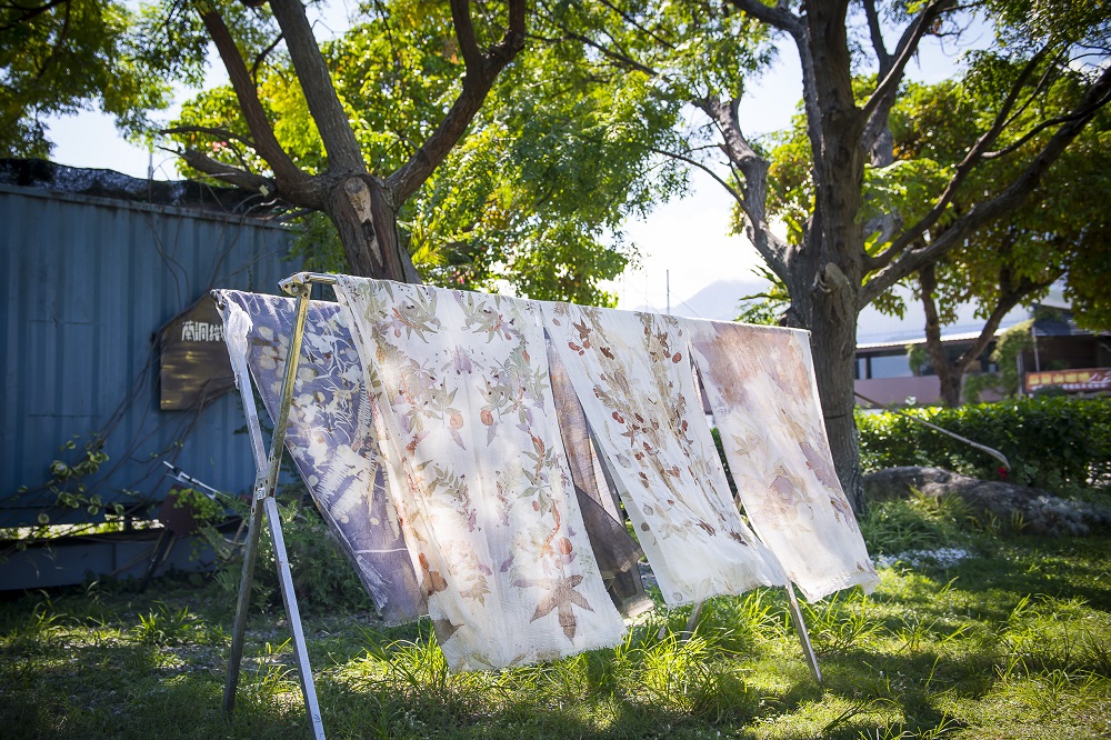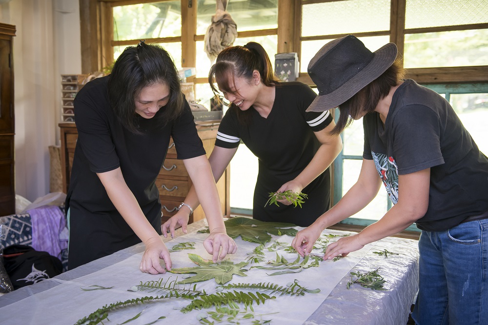 美麗的移印染圍巾,佈滿了樹葉、花朵自然而優美的姿態,是採集自部落常見民族植物,如台灣欒樹、黃荊等,以移印染技法,將植物的色彩和形狀保留在純羊毛織品上,每一次的創作都像是植物的盛宴,無法複製,因此每一條都是獨一無二的。