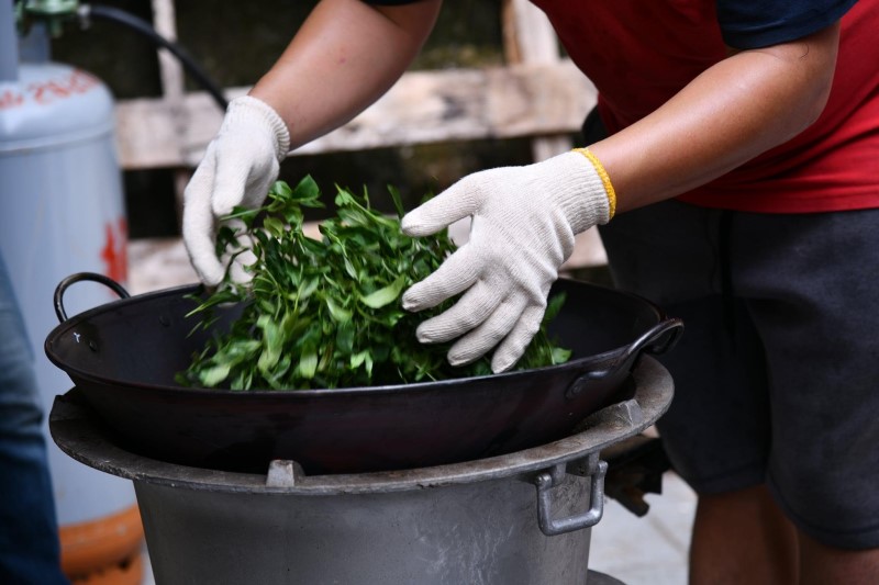 來到工作室檢查剛剛採摘的新鮮茶葉~