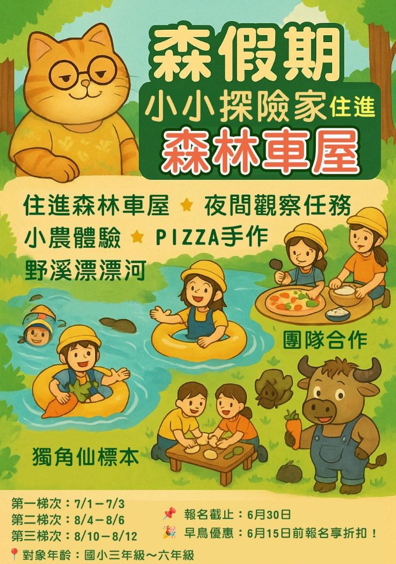 在嘉義中埔的自然森林車屋中展開三天兩夜的探險假期,透過專業師資與自然探索,引導孩子體驗 動手做 × 動腦想 × 動身體 的深度自然教育。