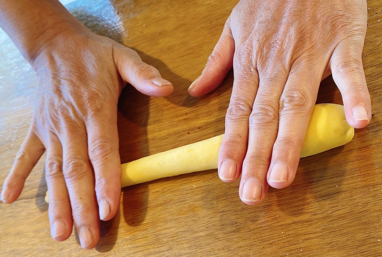 跟上跟上,老師說「你就搓、擀、拉、捲」老師一不小心就加速,做好了啦!