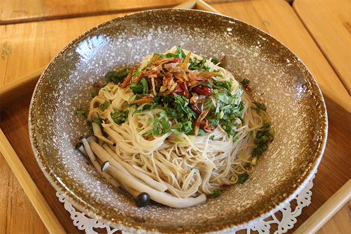 堅持使用自家生產的苦茶油,伴進熱騰騰起鍋的麵線,添點油蔥、枸杞與青菜配色,化身成最美味好吃又顧胃的苦茶油麵線。