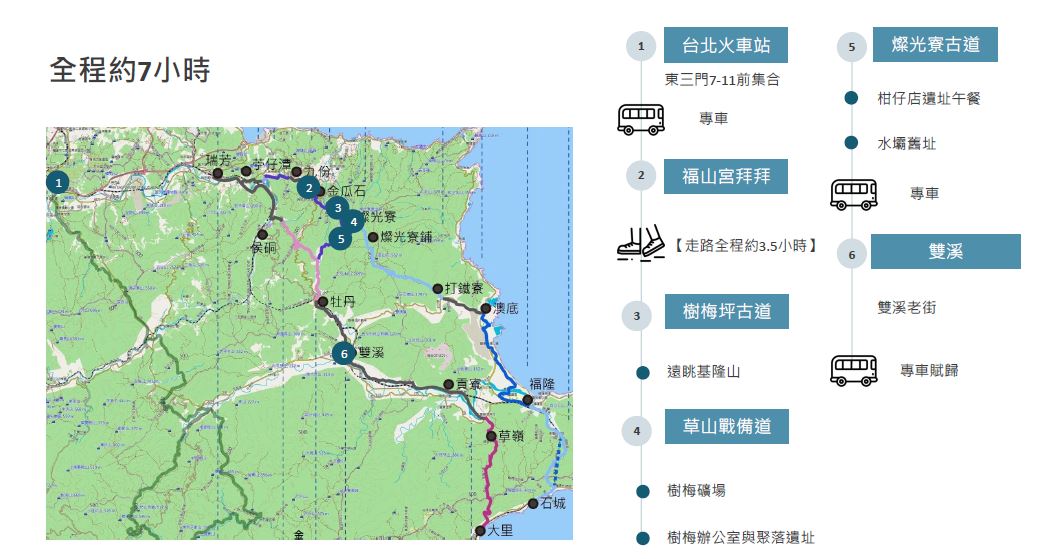 | 14:30-14:50 | 燦光寮古道到雙溪老街 | 車程 |
