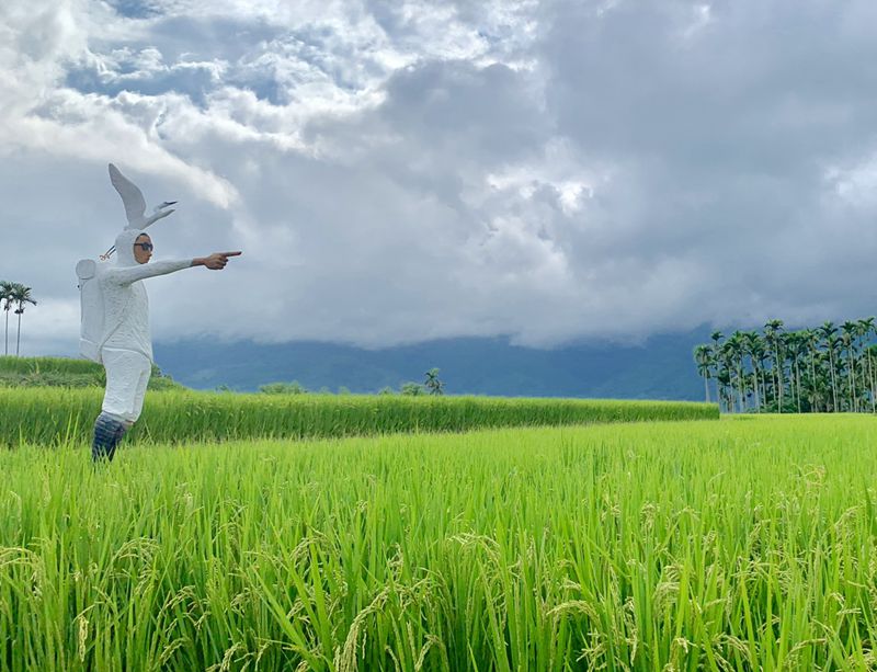 永恆的旅人啊!您將會在我的吟唱裡發現您的足跡 !漂鳥集 305首。日本木雕藝術家阿部乳坊首次造訪池上振興,即被眼前層層堆疊的梯田美景所震懾。出生自日本新潟的阿部,表示池上米香讓他想起同樣以白米稻田種植為主的故鄉新潟,因此他結合經常在稻田間飛翔的白鷺鷥,並結合人的模樣,以類似風見雞的形象,指著眼前那片讓他深受感動的鄉野風景。