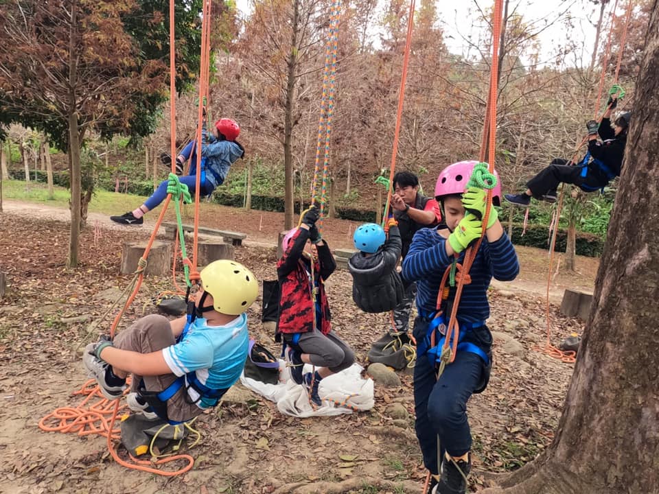 在教練的帶領之下,利用繩索技術,安全地攀爬數層樓高的大樹