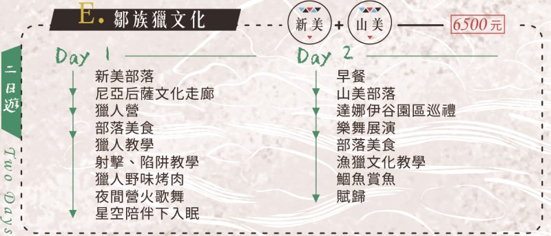 day1:新美部落→尼亞後薩文化走廊→獵人營→部落美食→獵人教學→射擊、陷阱教學→獵人野味烤肉→夜間營火歌舞(20人以上才有營火歌舞)→星空陪伴下入眠