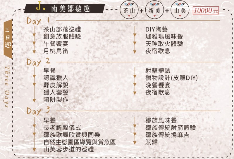 day3:早餐→長老祈福儀式→鄒族歌舞欣賞與同樂→自然生態園區導覽與賞魚區→山芙蓉步道的巡禮→鄒族風味餐→鄒族傳統射箭體驗→鄒族傳統搗麻吉→賦歸